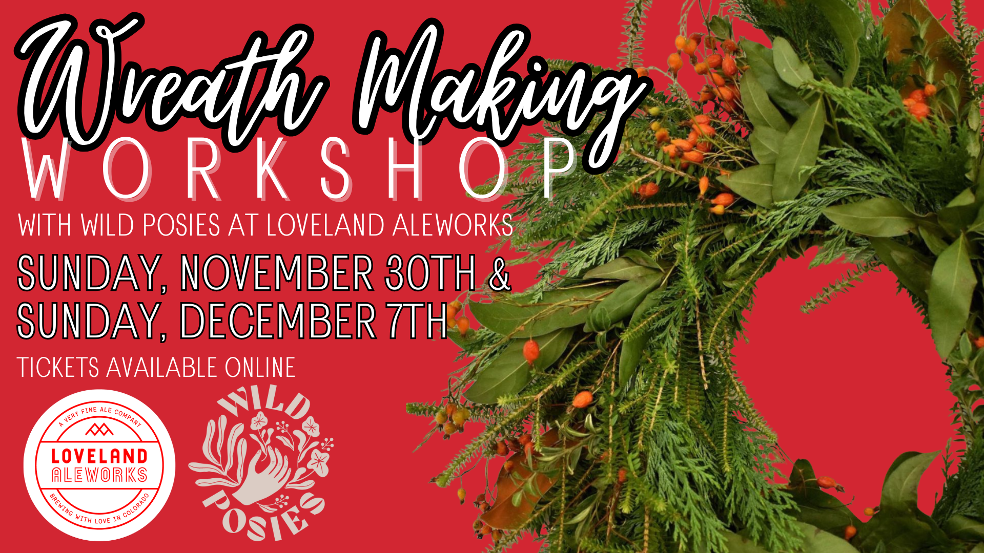 Get into the holiday spirit with a Holiday Wreath Making Workshop hosted by Wild Posies at Loveland Aleworks on Sunday, December 7th at 2 PM!