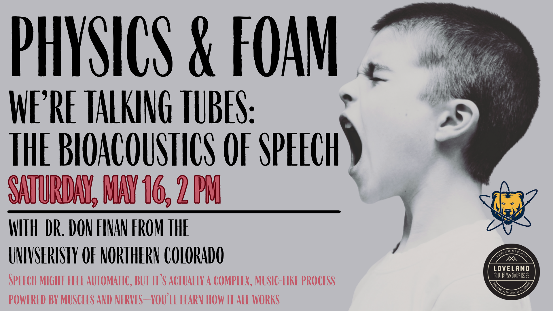 Blurb: Speech is one of those things that you probably don't think about - you just do it. But how do we produce speech? Speech is sound, and we use over 70 muscles and 15 cranial and spinal nerves to produce that sound. Surprisingly, the way this all works is very similar to how many musical instruments work. Dr. Don Finan, from the University of Northern Colorado Department of Communication Sciences and Disorders, will discuss how musical instruments and our own anatomy make sounds and how we can make duck calls talk! And yes, why we are talking tubes! Join us for Physics and Foam, complete with delicious beer, fascinating science, and trivia for prizes!