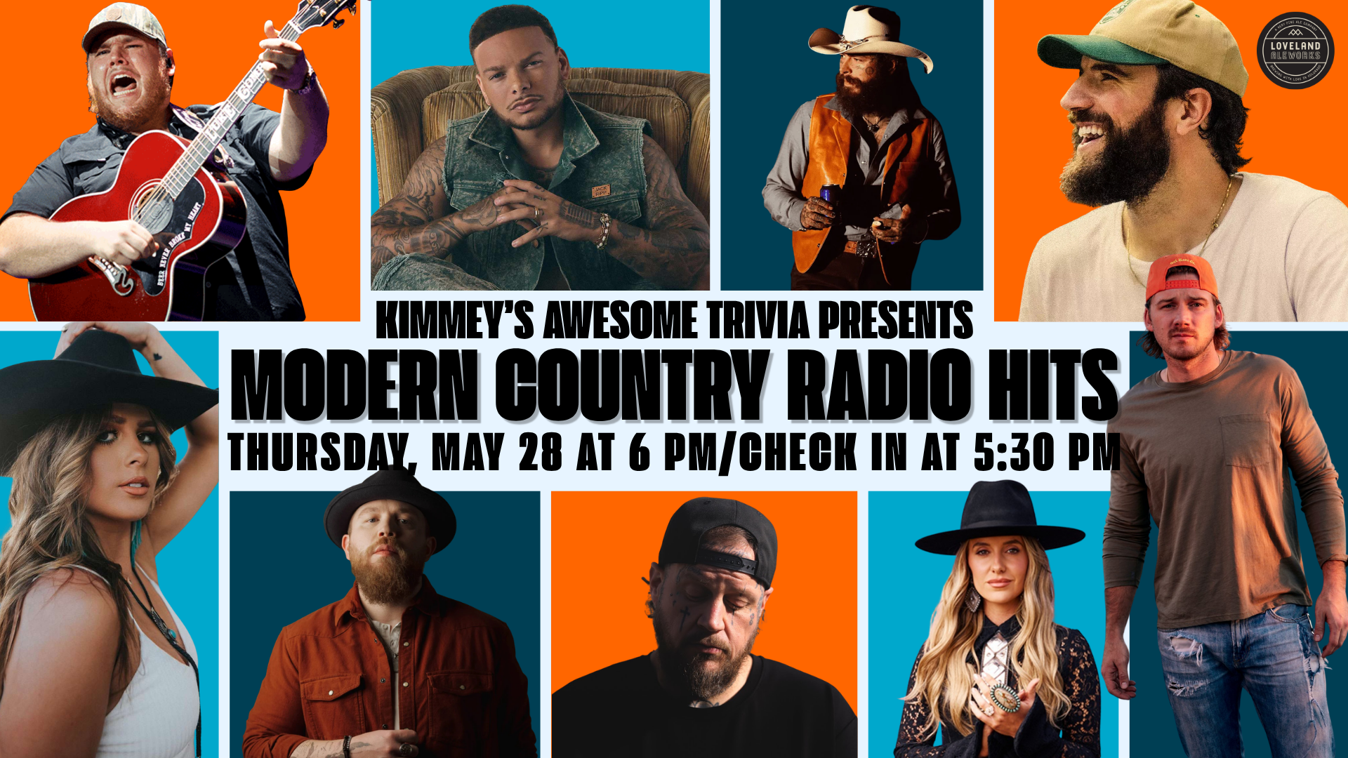 Turn up the radio favorites—Name That Song Trivia: Modern Country Radio Hits is this week’s Kimmey’s Awesome Trivia at Loveland Aleworks on Thursday, May 28 at 6 PM!
